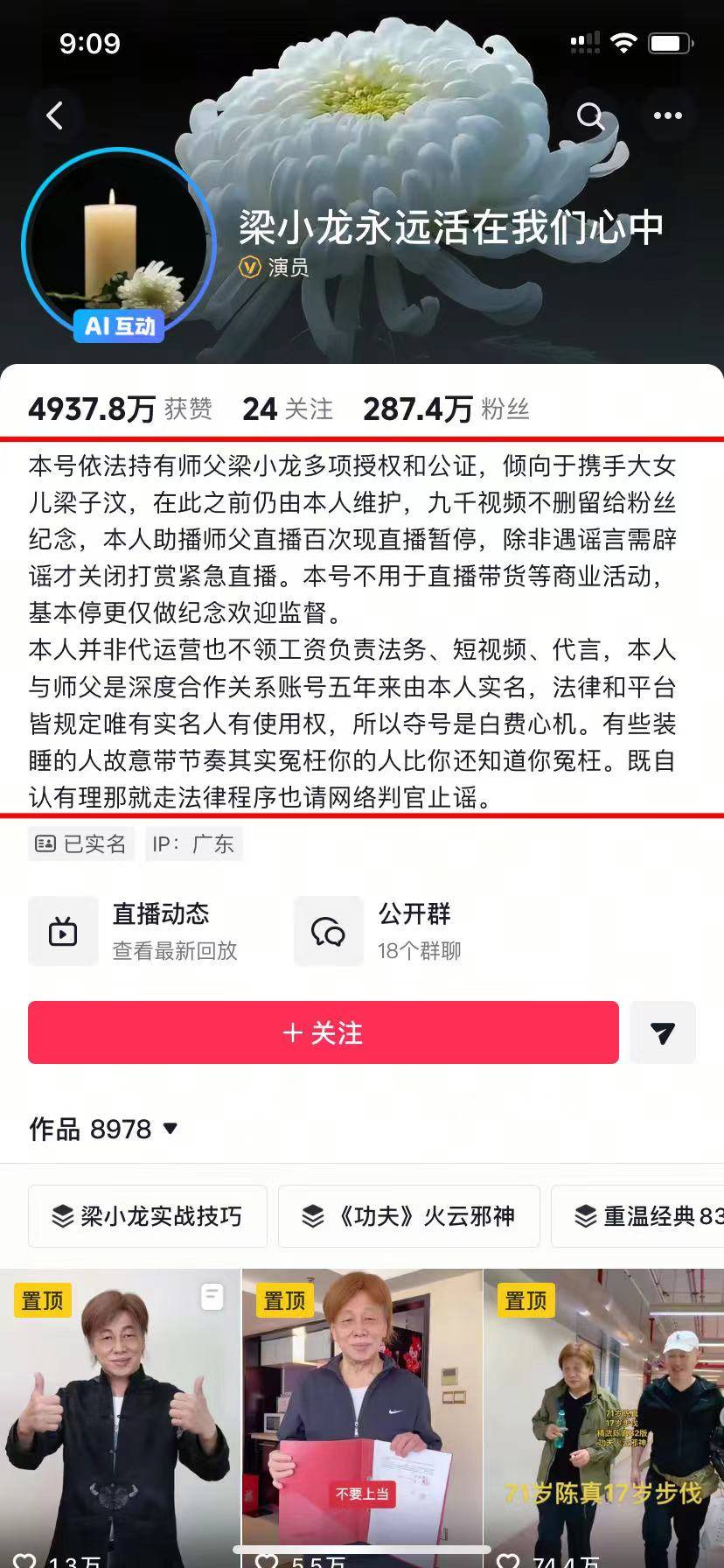 账号说明依法持有师傅梁小龙多项授权和公证,倾向于携手大女儿梁子汶,在此之前仍由本人维护,九千视频不删留给粉丝纪念,本人助播师傅直播百次现直播暂停,除非遇谣言需辟谣才关闭打赏紧急直播。本号不用于直播带货等商业活动,基本停更仅做纪念欢迎监督。