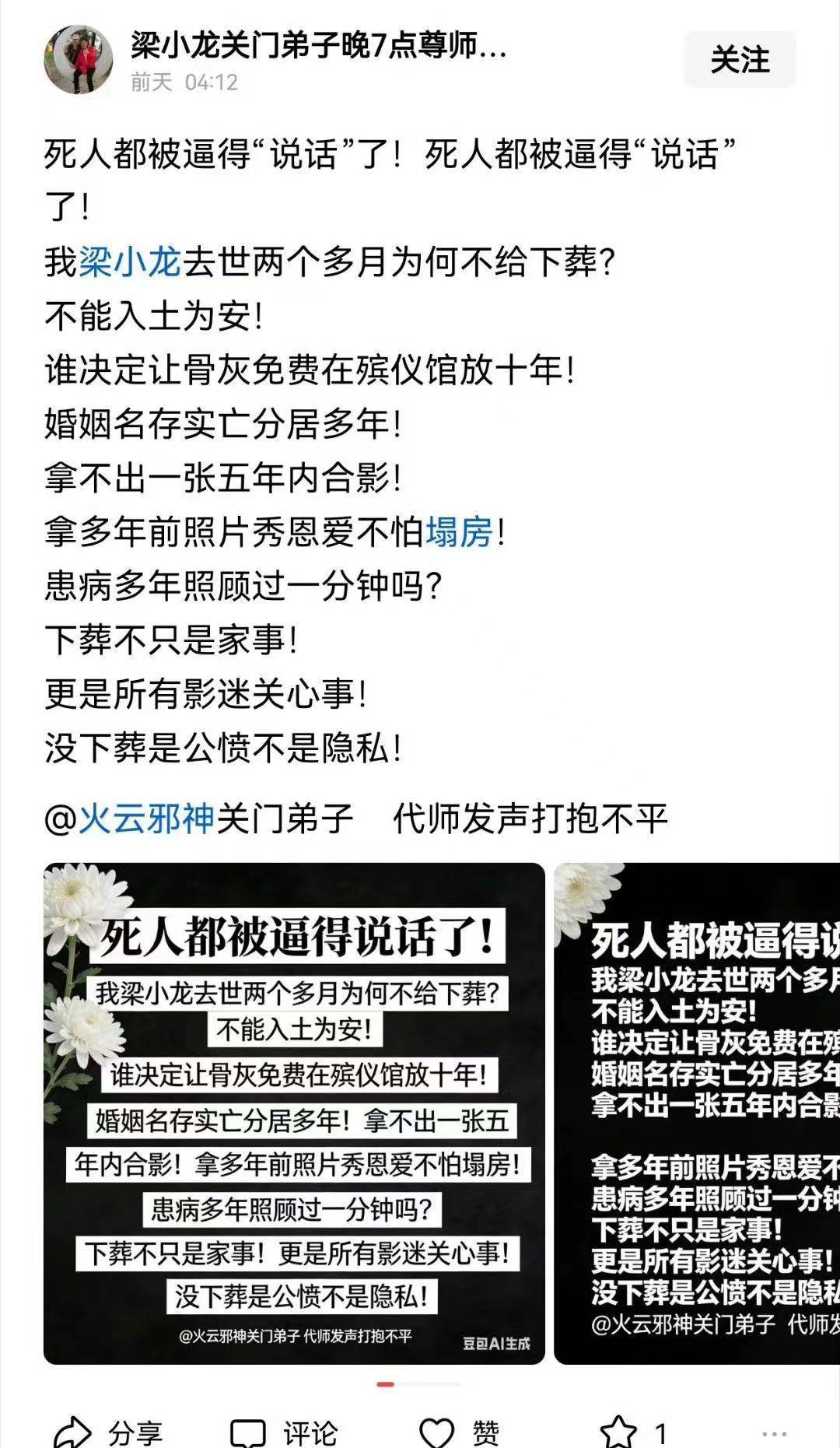 梁小龙的妻子宋骧要求老公的徒弟归还账号,这个账号一直在发布内容,宋骧是第一顺位继承人,她完全可以起诉这个徒弟,但她为什么又迟迟不让老公下葬,入土为安,也是令人很诧异,无法理解,归还账号的事可以慢慢处理,但老公去世不下葬似乎说不过去。