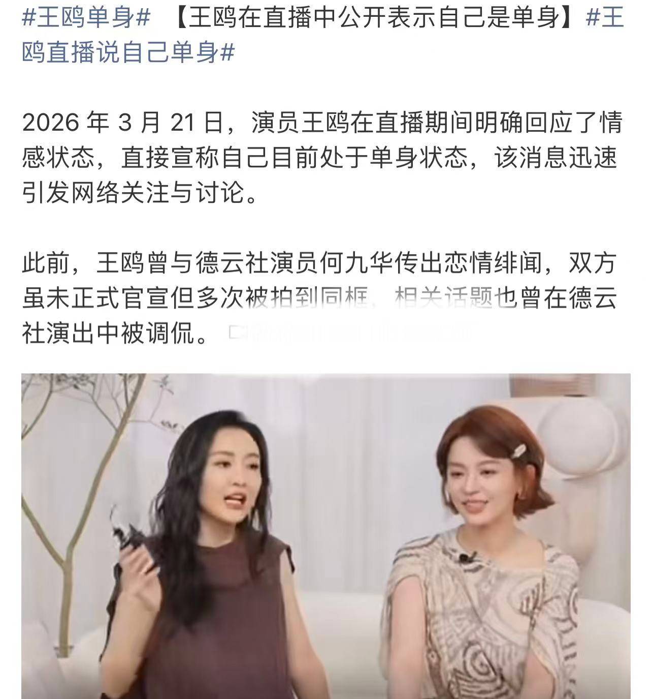 2026年3月21日,王鸥在直播里一句“我现在是单身”,直接把#王鸥单身#的话题炸上热搜。没有迂回,没有含糊,干脆利落的表态,给纠缠她近5年的情感绯闻,画上了一个清晰的句号。