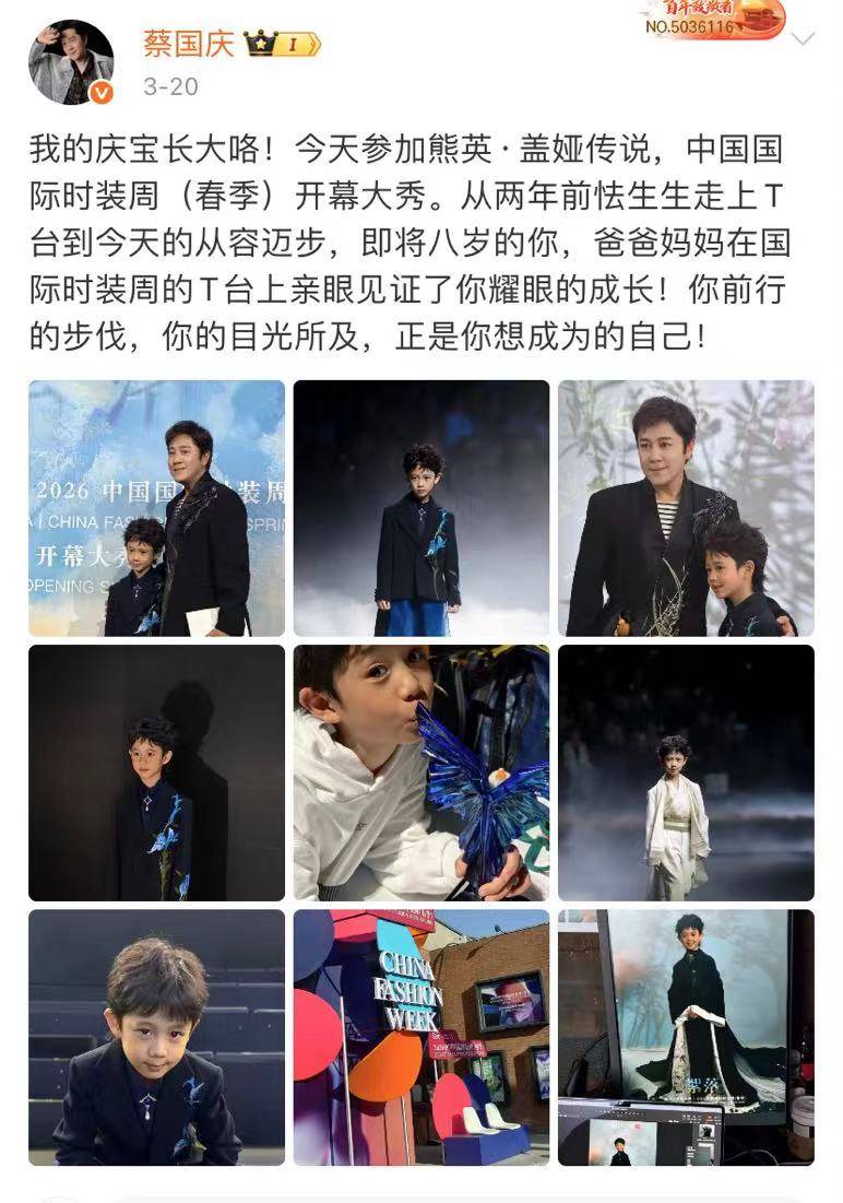 蔡国庆从来不晒老婆,但却在文字中提到,表示小儿子庆宝两年前就到国际时装周走T台了,爸爸妈妈都见证了儿子的成长,可怜天下父母心,大明星也如此,都是望子成龙,望女成凤。不影响学业的前提下,学会走猫步也未必不可以,庆宝长得很帅气,未来可期。
