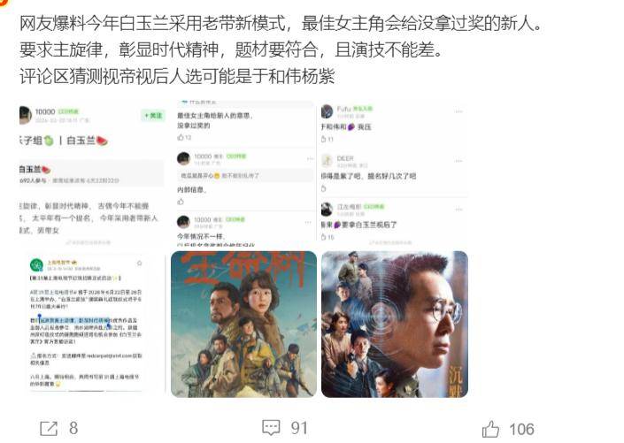 当大家都在好奇,哪五位演员会顺利入围的时候,网上突然传出消息,今年的白玉兰奖采用“老带新模式”,最佳女主角奖给没拿过奖的新人,但演技一定要在线,作品肯定是主旋律。
