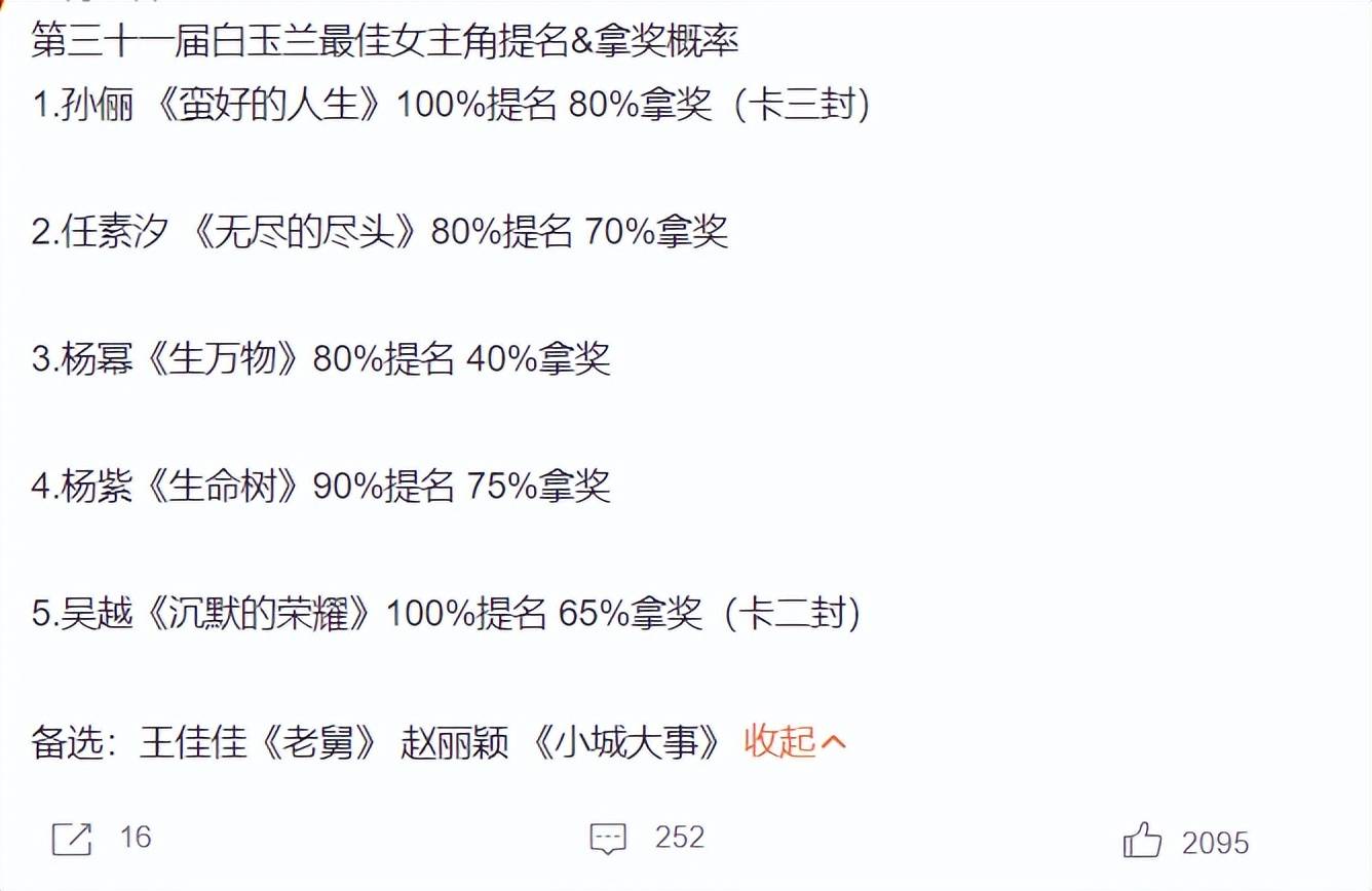 我们都知道,每年的白玉兰最佳女主角竞争都非常激烈,但相比于前几届,本季的竞争更为激烈,因为多位女演员都拿出高质量作品,但入围的只会有五个人。