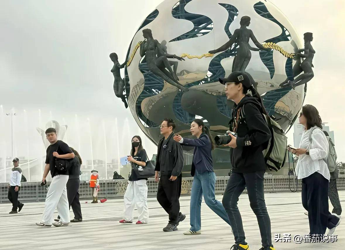 细看画面,可以发现尽管李连杰已年届64岁,他依旧保持着挺拔的身姿,步伐稳健而自信,未见明显的衰老迹象。他所站立的潮雕塑由不锈钢镂空球体和七位青铜少女雕像组成,寓意七仙女下凡,成为北海银滩最具象征性的地标之一。这座雕塑与他的身影形成鲜明对比——银白与青铜、静态与动态,仿佛在诉说着岁月与传奇的交错。