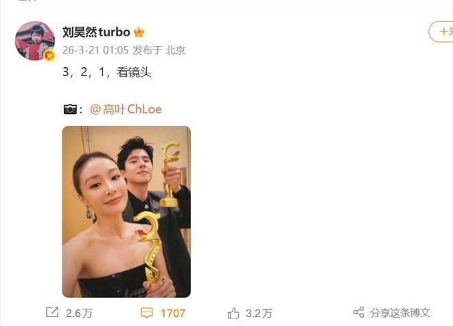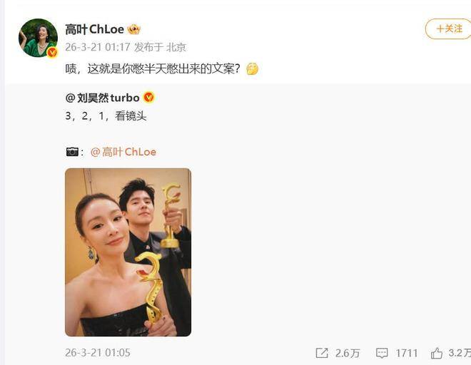 颁奖的第二天,刘昊然通过微博晒出了一张他与高叶并肩,手持奖杯的照片,配文十分简洁:3,2,1,看镜头。并且还特意@了高叶。这条看似直白、甚至略带直男风格的微博,迅速吸引了高叶的犀利回应。高叶转发了这条微博,并毫不留情地调侃道:啧,这就是你憋半天憋出来的文案?她的这番玩笑话瞬间引发了网友们的热烈讨论。网友们纷纷感叹,这种姐弟式的互动不仅有趣,还十分自然,让人看到了他们之间真实、亲密的默契与关系。