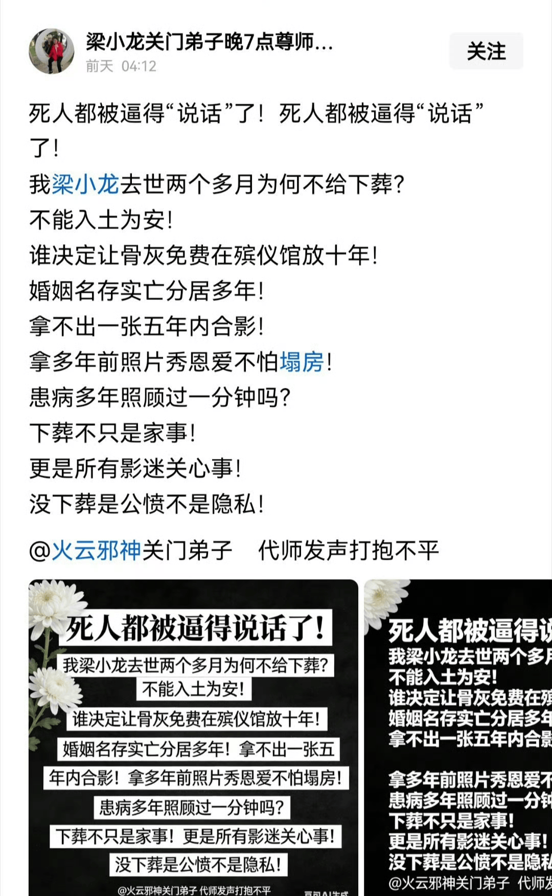 虽然这场“停棺大戏”比电视剧还精彩,但网友们也没忘记梁老师的贡献。毕竟他可是那个在《大侠霍元甲》里一脚踢碎“东亚病夫”牌匾的陈真,是《功夫》里“天下武功,无坚不破,唯快不破”的火云邪神!