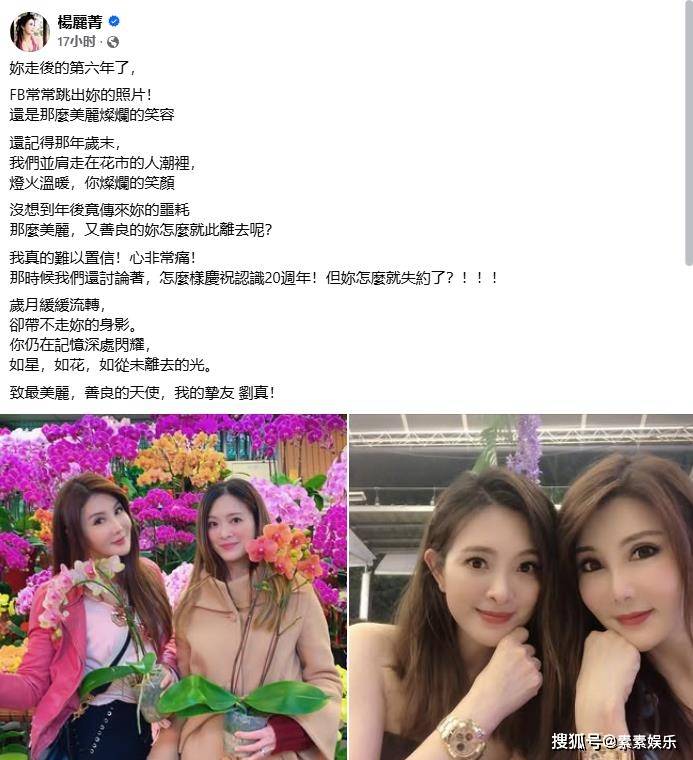 两个美人站在一起,杨丽菁感性写下:你离开后的第六年了,脸书常常跳出你的照片!依旧是那般美丽灿烂的笑容。