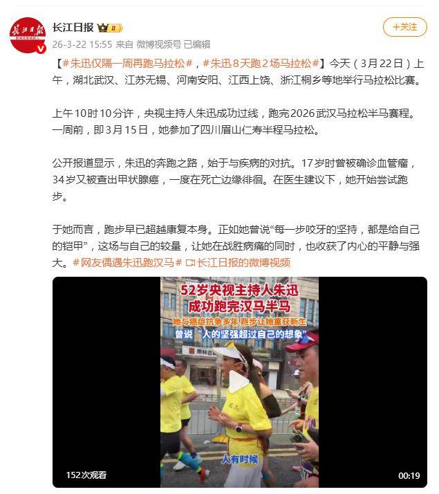 这波密集的奔跑狂潮,恰逢3月22日全国多地马拉松“扎堆开跑”的热闹周末。从湖北武汉、江苏无锡到江西上饶,跑友们用脚步丈量城市。而在武汉的赛道上,朱迅的身影格外引人注目——这不仅关乎体育,更关乎一场跨越了生死界限的生命逆袭。