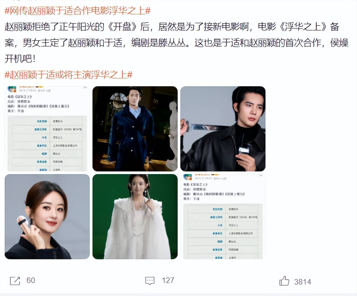 从传出的消息上看,赵丽颖似乎并没有接《开盘》,而是选择一部电影,这部电影就是《浮华之上》。