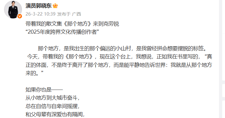 郭晓东凭借新书《那个地方》喜提2025克劳锐第9届新媒体生态大会克劳锐“2025年度跨界文化传播创作者”!2026年3月22号上午10:39,著名男演员郭晓东在其个人社交平台