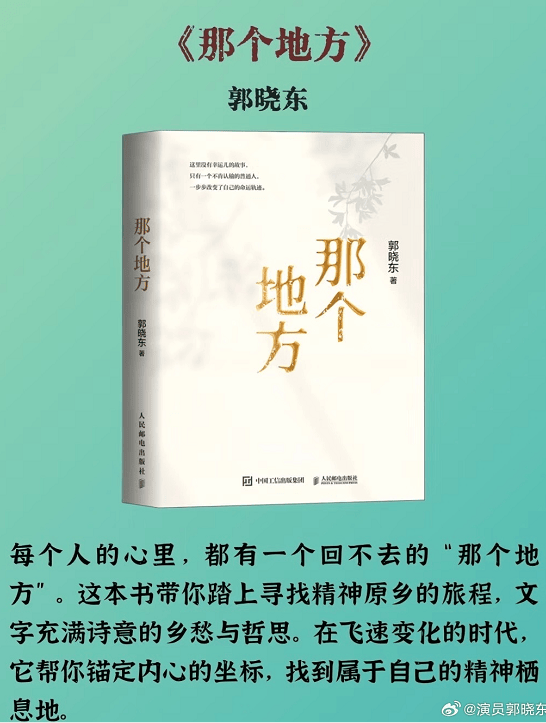 《那个地方》是郭晓东于2025年10月推出的首部散文集,由人民邮电出版社出版发行,收录了他两年来创作的32篇真挚随笔,是一部褪去演员光环、回归本心的真诚之作。该书以细腻质朴的笔触,回溯了郭晓东从山东临沂市莒南县坊前镇大坊前村走到北京的完整成长轨迹,涵盖童年乡间的宁静日常、初中辍学后打工的艰辛无奈、北漂岁月的迷茫坚守,以及对父母、亲人的深切牵挂与愧疚,没有刻意渲染传奇色彩,只讲述一个平凡人凭借韧性冲破困境、逐梦前行的故事。