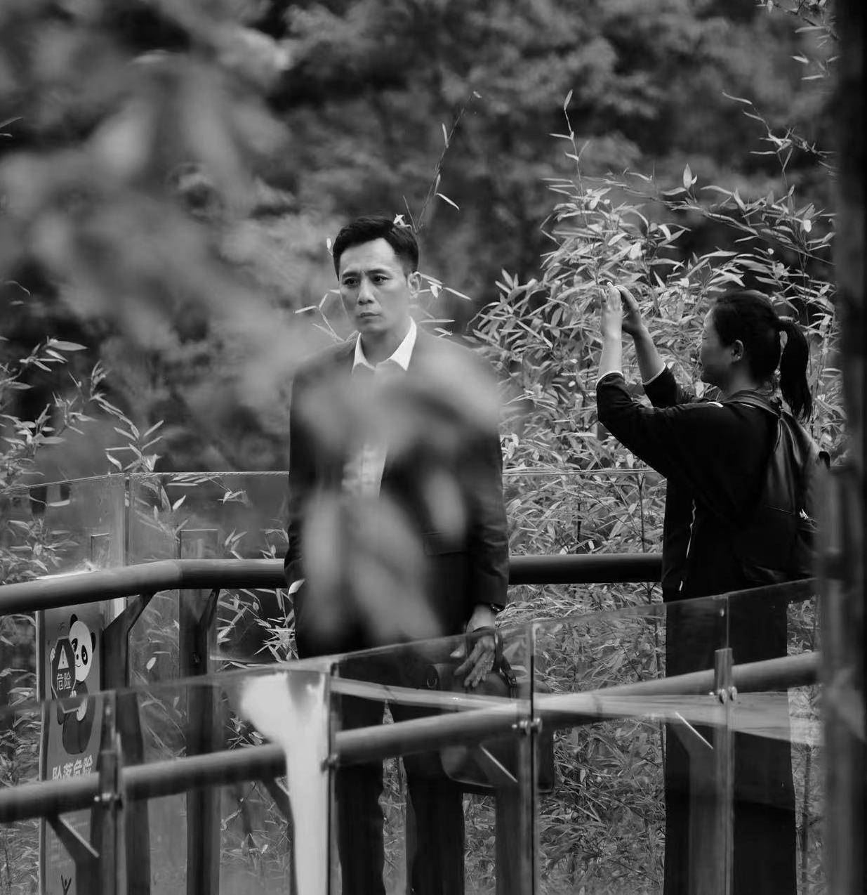 第二张是黑白质感的工作照。刘烨穿着西装,手提黑色包,目光望向远方。那种演员长期积累下来的“站位感”,在黑白影像里被放大了。