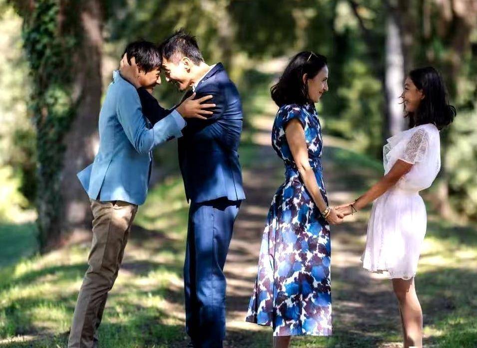 一家四口站在林间小道上,绿树成荫,光影斑驳。刘烨和儿子诺一都穿得正经又有型,父子俩面对面,头贴头,笑容灿烂。