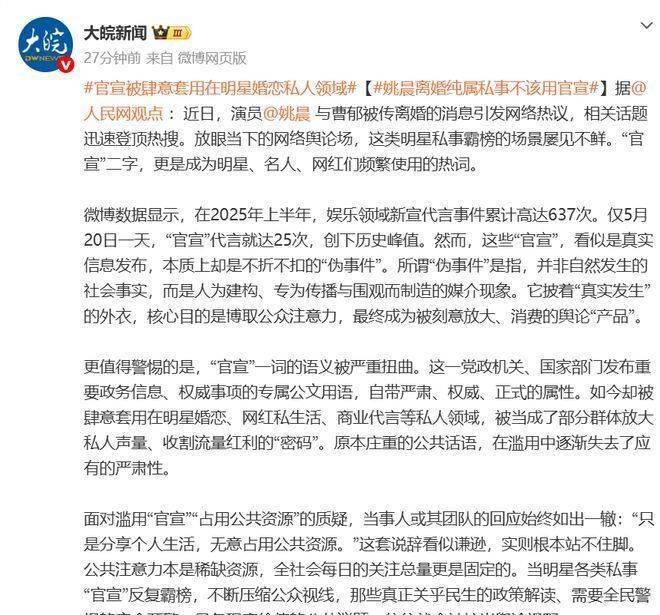 姚晨的离婚事件只是一个缩影,真正该整治的,是这股滥用“官宣”、收割流量的歪风邪气。