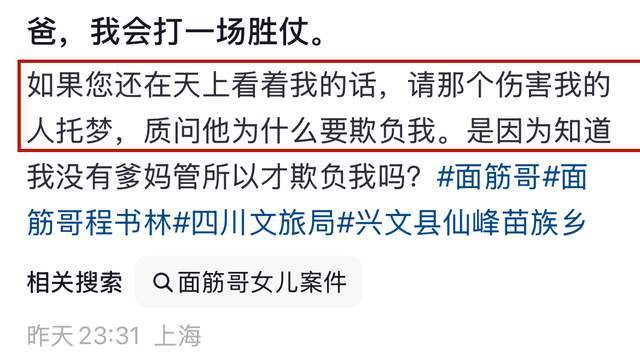 3月22号晚,面筋哥女儿程冷潇突然曝出一则令人愤怒却炸裂的消息,并在留言处感慨的说道:爸,我会打一场胜仗,如果你还在天上看着我的话,请那个伤害我的人托梦,质问他为什么要欺负我,是因为知道我没有爹妈所以才欺负我吗?