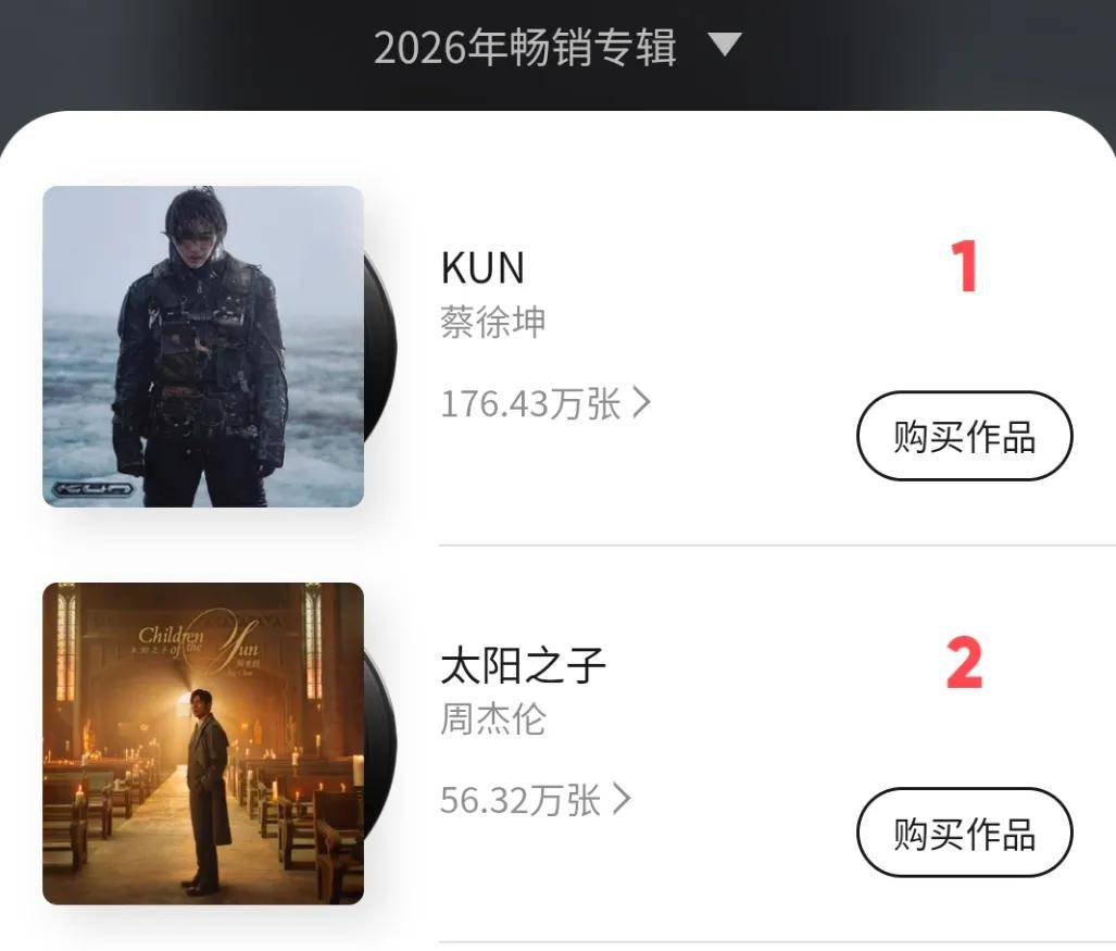 不管是和目前单平台销量第一的蔡徐坤2026年新专辑比,还是和周杰伦自己上一张专辑《最伟大的作品》比,《太阳之子》销量都差了一大截!