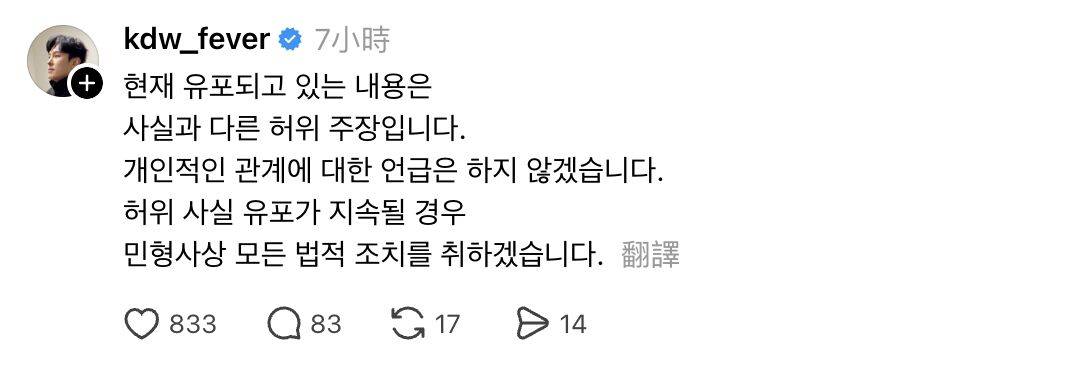 这篇来自前经纪人的爆料文很快就被传开,金烔完23日在threads低调回应「现在外流的内容与事实不符,全是虚假的主张言论,因为涉及私人的关系,我就不再提及说明,但如果有持续散播谣言的情况,我会采取民事、刑事所有法律责任。」