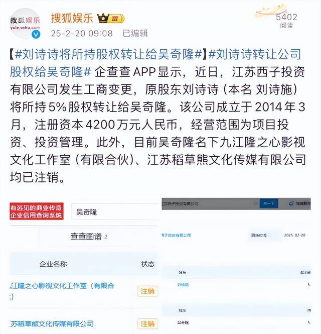 而且在2025年刘诗诗将公司股权转让给了吴奇隆,有网友解读说两人是在做财产分割。