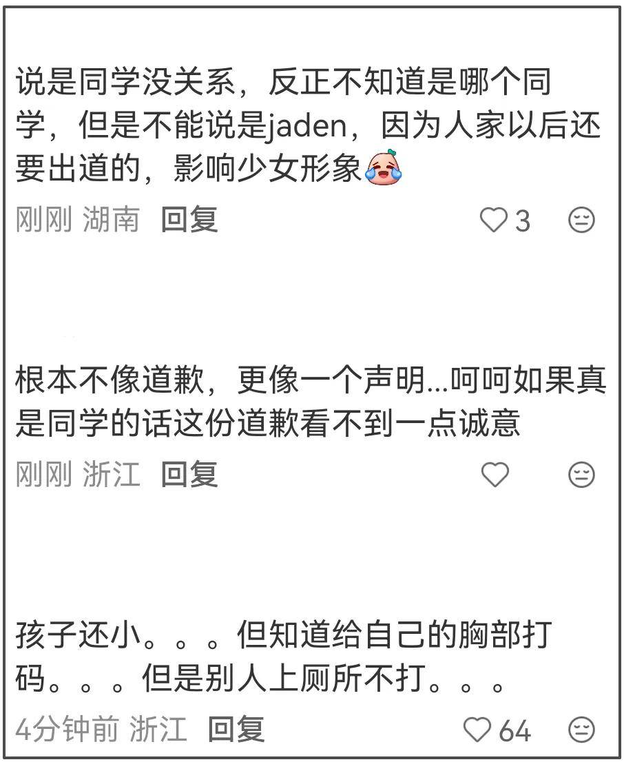 另外,钟丽缇文章中的那句“孩子还小”实在让人无语至极。考拉今年已经16岁了,实在称不上是一个孩子。更何况,钟丽缇口中的“没有意识到边界问题的孩子”记得将自己的胸前打码,却不记得给上厕所的同学打码。事情发展到现在,考拉还躲在妈妈身后,一声不吭,连个道歉都没有,着实让人愤慨。