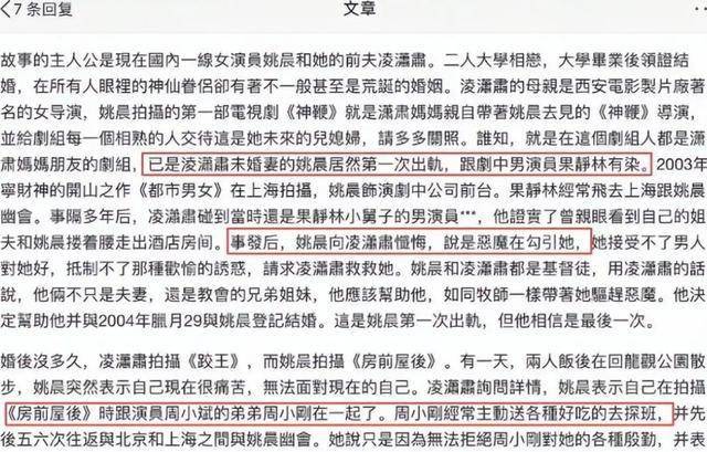 姚晨在与凌潇肃婚姻期间,曾四次出轨,涉及演员果静林、导演周小刚、孙红雷及后来的丈夫曹郁,甚至在2010年就与曹郁相恋,那个时候,姚晨和凌潇肃还没有离婚。