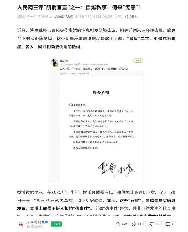 3月23日,人民网发布评论文章《三评“所谓官宣”之一:自爆私事,何来“无意”!》,