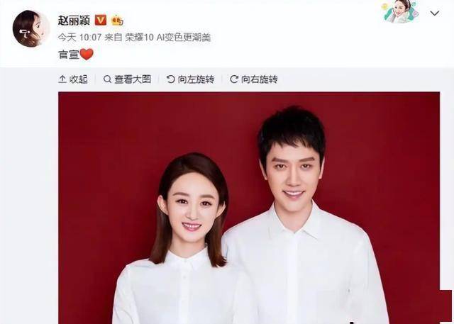 与此同时,冯绍峰也同步晒出结婚证,配文同样是“官宣”,还在赵丽颖的微博下方评论“老婆,生日快乐”。