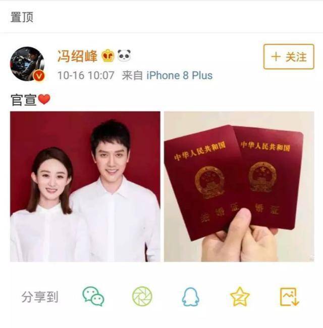 这一天,她没有像往常一样发微博庆生,而是突然晒出了自己与冯绍峰的结婚证,配文只有两个字——“官宣”。