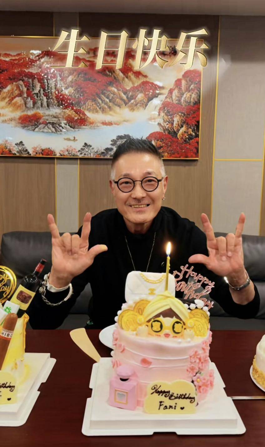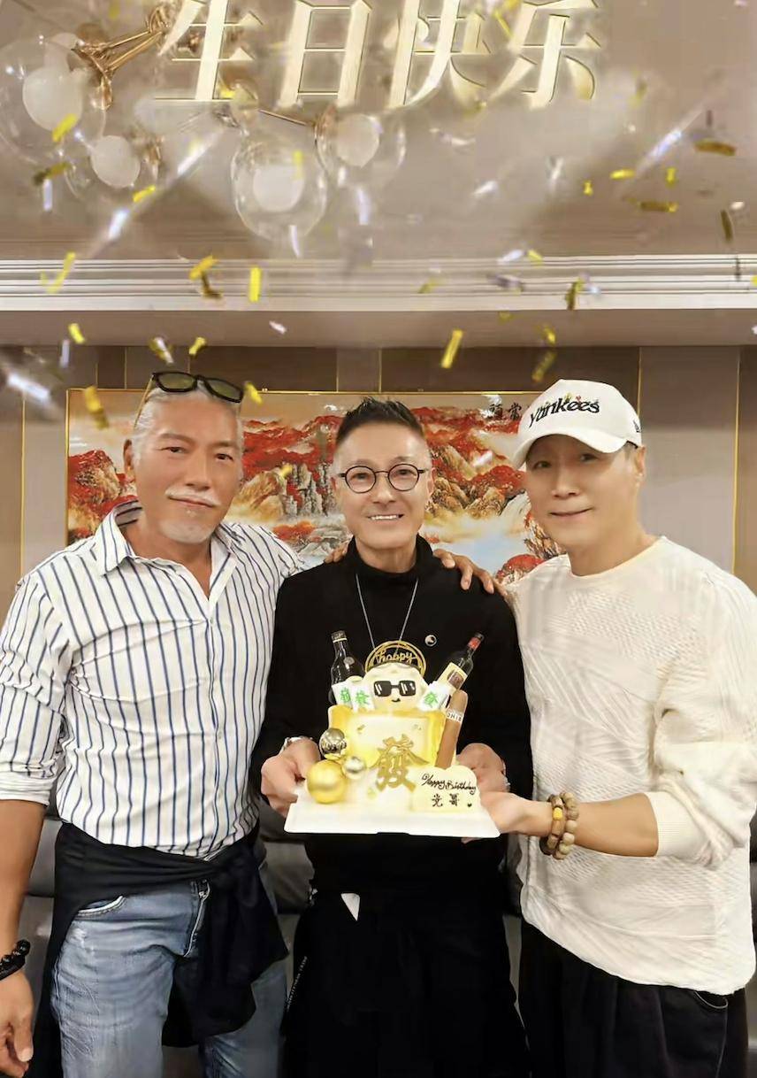 张耀扬与林国斌一同为卢惠光庆生,现场还准备了多个定制的蛋糕,其中有一个蛋糕最特别,上有一个显眼的“發”字,还有雪茄、红酒的摆设,显然就是一个为中年人量身打造的蛋糕。蛋糕前还放了一块牌子,上面写着“光哥生日快乐”。三人捧着蛋糕合照,卢惠光站在中间,他年纪最大,不过也不显老,张耀扬与林国斌站在他的两边,手都自然地搭在他的肩膀上。