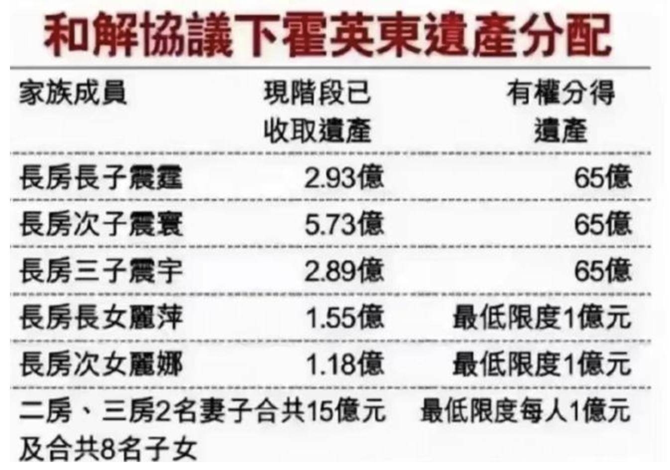 冯坚妮生前留下了多少遗产,不得而知,以霍家的家族制度来看,冯坚妮所持有的财产理应不会太多。霍家走的是公有制,霍英东留下的这些物业、资产,都没有进行实质上的分配,仍然是以霍英东家族的名义所持有。因此霍英东离世之后,并没有所谓的分产,其家族成员根据不同的情况每个月能从霍英东家族基金会中获取生活费,重点是这个生活费,也不是外界所认为的每个人每个月几十万甚至几百万。事实上,家族成员中能够从基金会提取的生活费,最高的也就是霍震寰,每个月10万,而像霍震霆每个月也就五万,女儿更少才一万。