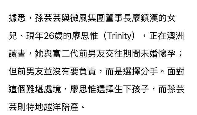 媒体称,廖思惟整个孕期,孙芸芸都在其身边陪伴,从产检安排、生活起居到医疗资源衔接,皆亲自处理。