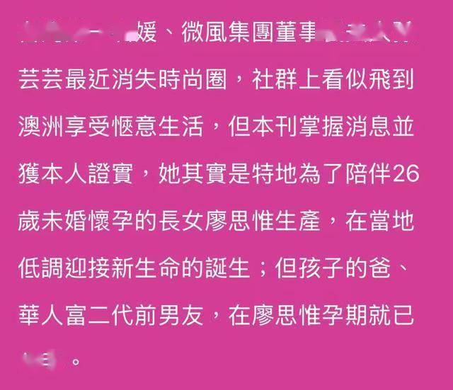 此事已得到当事人确认,孙芸芸的女儿廖思惟(26岁)未婚先孕,与男朋友分手后,在澳洲生下了小孩。