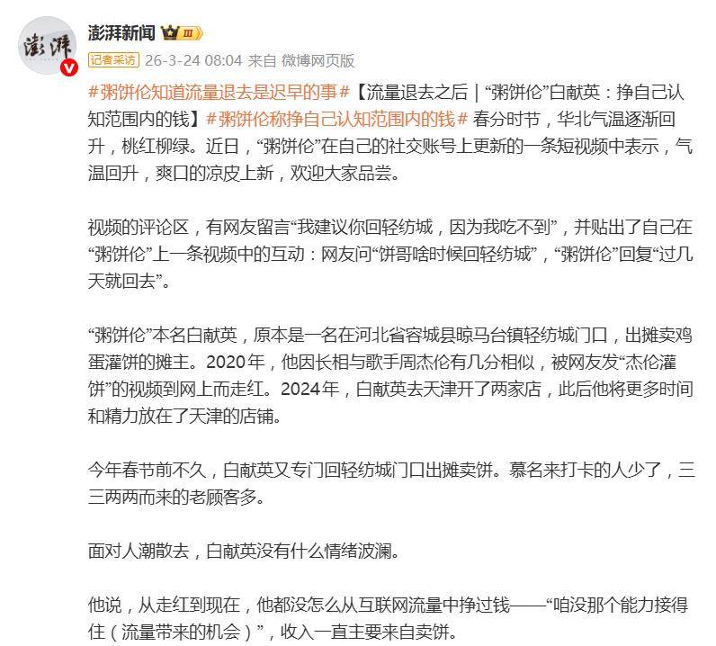 总而言之,从“杰伦灌饼”到上新凉皮,“粥饼伦”的故事更像是一个关于“落地”的样本。流量如风,来得猛,去得也快。当热闹散去,能稳稳撑住生活的,终究不是那阵风,而是手里那份实实在在、热气腾腾的手艺。他的“饼”,既是生计,也是在这场网络奇遇中,保持清醒与自我的压舱石。