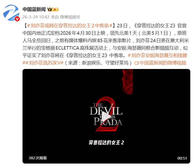 一则定档消息,加上一张合影,瞬间让内娱和好莱坞的八卦雷达同时响彻云霄。据3月24日报道,《穿普拉达的女王2》官宣中国内地定档2026年4月30日,不仅领先北美一天上映,更抛出了“原班人马回归”的重磅炸弹。而真正点燃网友好奇心的,是紧随其后爆出的“内娱85花客串”传闻,以及刘亦菲与安妮·海瑟薇在米兰的那场高调同框。