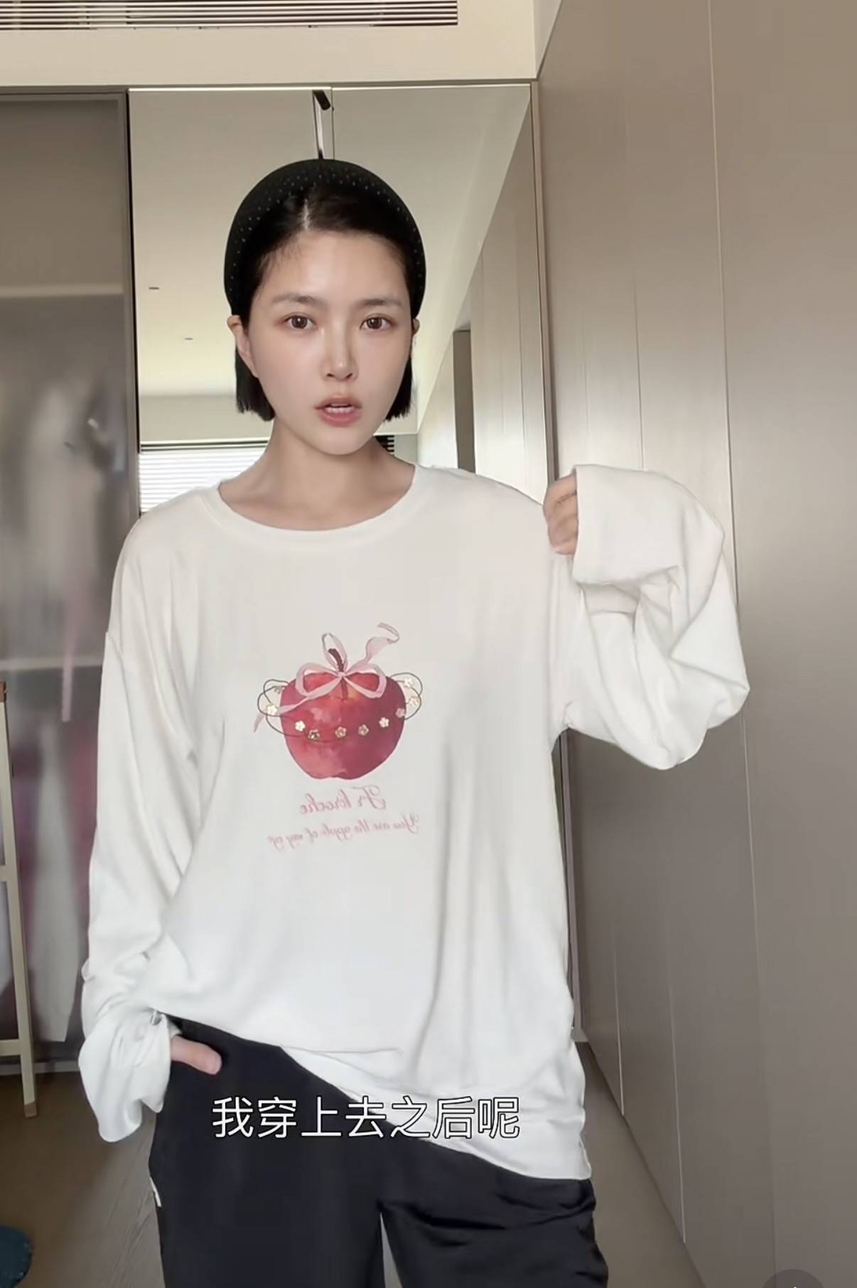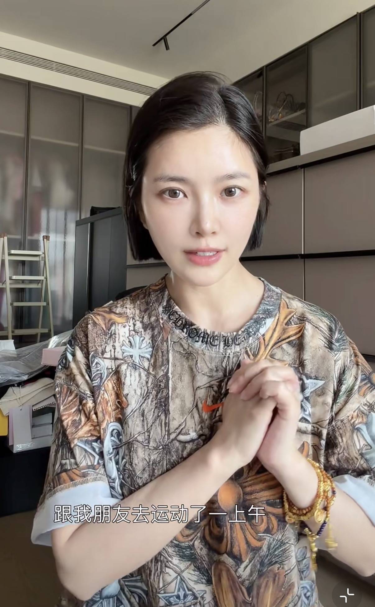 近期王灿剪了短发,整个人看着挺清爽的。视频中她穿一件宽松的印花T恤,是非常休闲个性的款式。