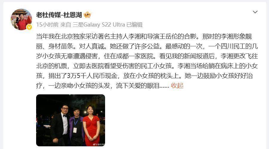 就在大家以为这事要随着3月17日账号解禁慢慢平息时,一位知名媒体人的微博突然引爆热搜。这位媒体人晒出早年在北京独家采访李湘和王岳伦的合影,照片里的李湘穿着简约却亮眼,身材苗条气质干练,完全不是后来大家印象中 "富态阔太" 的模样。