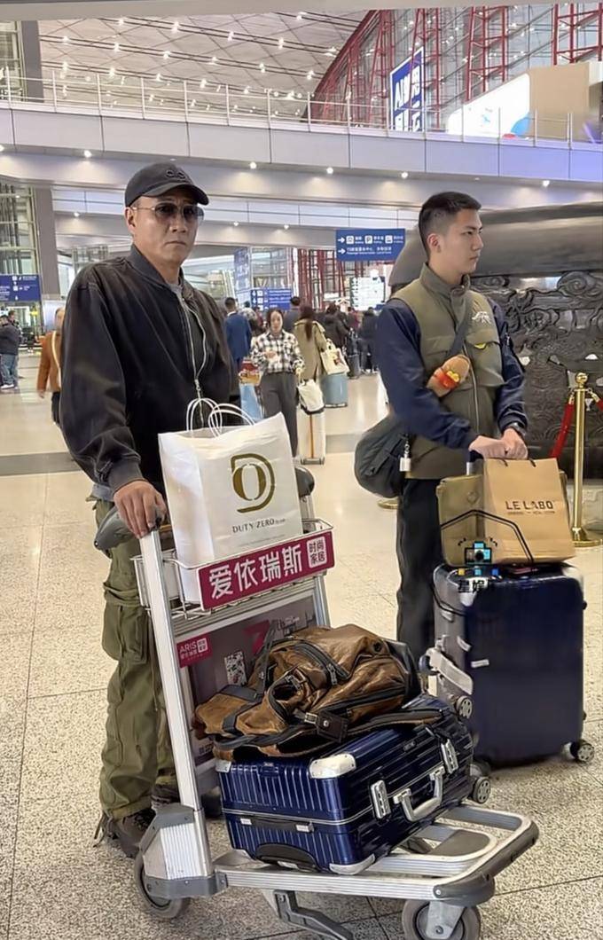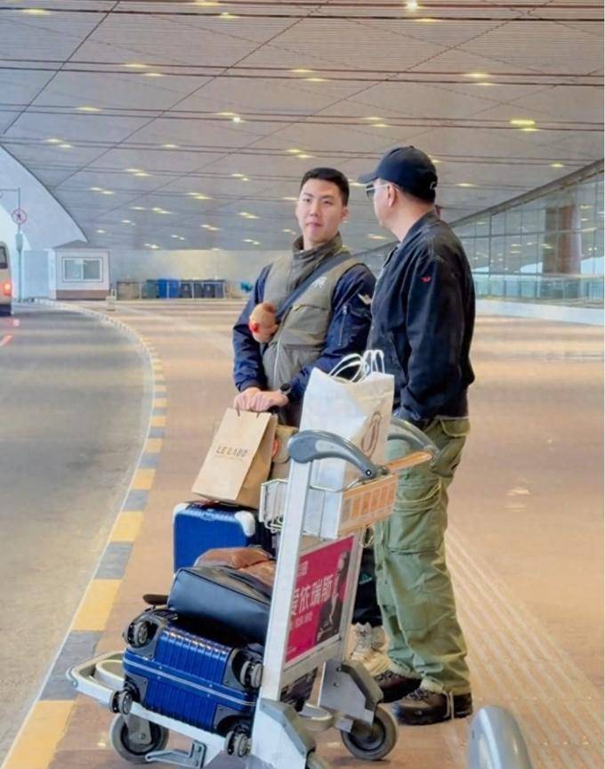 3月23号的机场,胡军和儿子康康一出来就挺显眼,胡军穿着黑色夹克和军绿色工装裤,戴着棒球帽和墨镜,样子还是那么硬朗,旁边的康康,梳着利落的板寸头,走路背挺得笔直,真像刚在部队里待