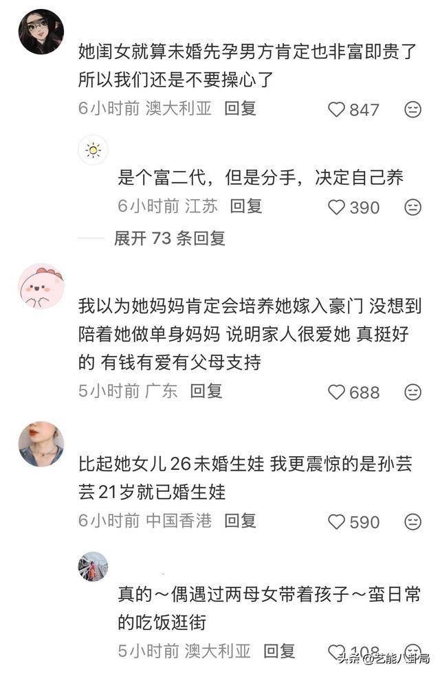 消息曝光后,评论区热闹非凡,有网友表示:“孙芸芸的闺女就算未婚先孕,男方肯定也非富即贵了,所以我们还是不要操心了。”