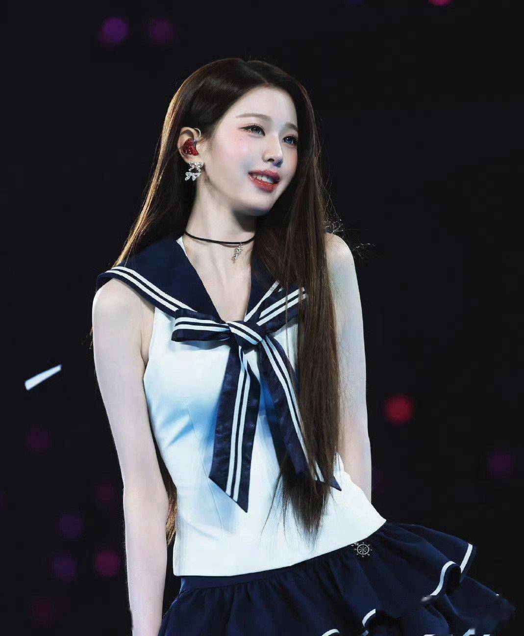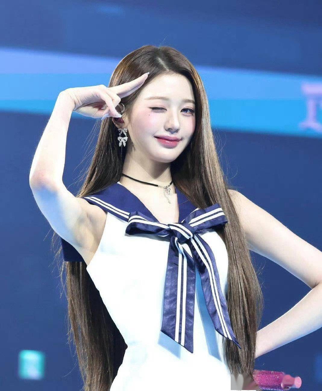 3月21日,IVE在首尔举行粉丝见面会。张元英出场时,台下安静了几秒,接着是炸开的尖叫。#全国春日美景图鉴#她穿了一身蓝白水手服。藏蓝色的短款西装,白色的海军领衬衫,百褶短裙,过