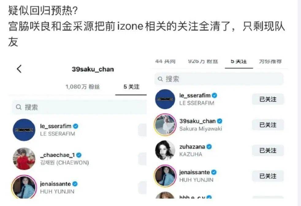 两人行动高度一致(仅保留现队友及官方账号),且HYBE长期统一管理艺人社交账号,因此公司指令是主流推测。例如:宫胁咲良同时取关了日本前辈艺人及个人美瞳品牌账号;金采源连个人宠物账号也一并清理,进一步佐证非个人自发行为。