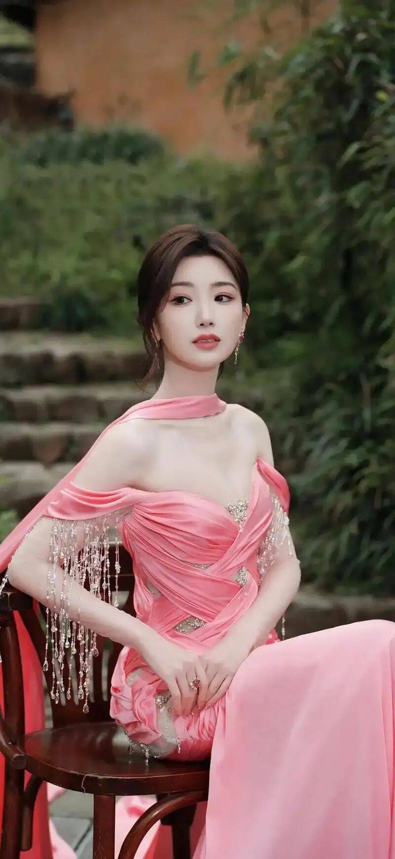 毛晓彤穿着一袭粉色抹胸衣裙,她俏脸甜美,微微染红的长发梳成中分,她坐在椅子上,露出白皙的香肩和事业线,大秀曼妙的身材曲线,绝对性感撩人!