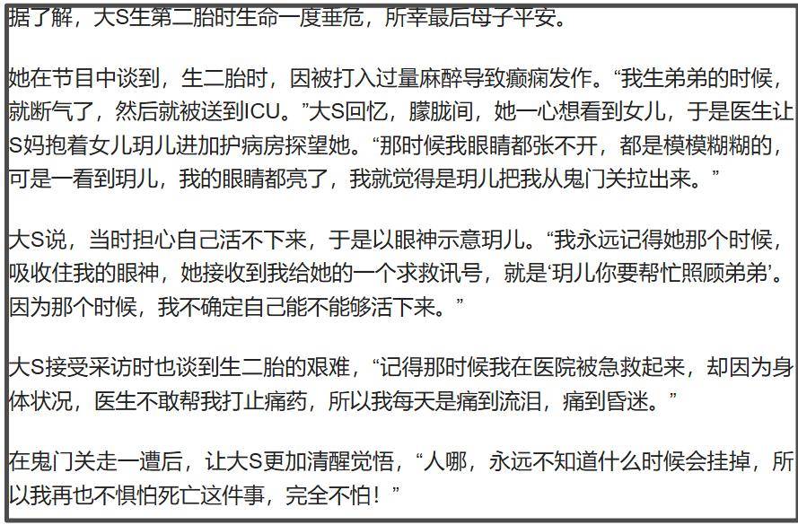 大S在20多岁的年纪就想好了要在葬礼放哪一首歌,生二胎经历癫痫,被抢救过来的大S从此更加坚定了自己的生死观念,她觉得人永远不知道什么时候会挂掉,所以她再也不惧怕死亡这件事。