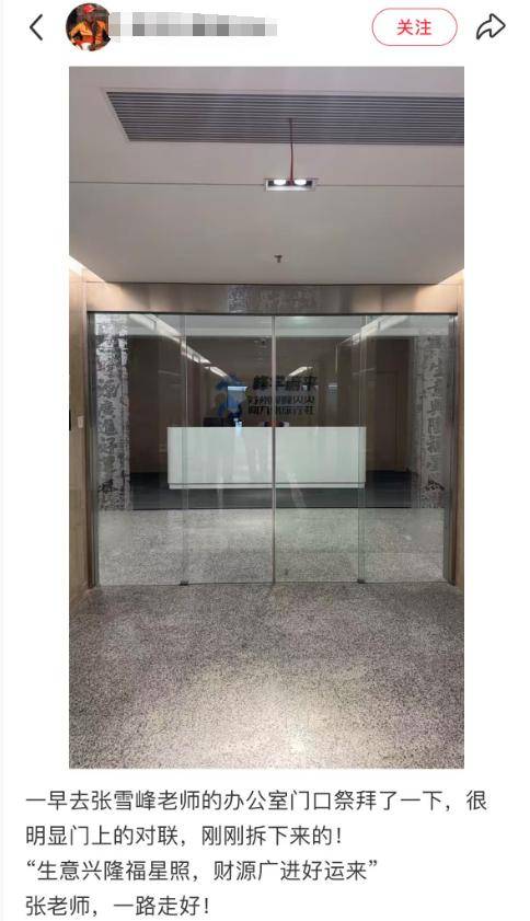 3月25日一早,有网友前去张雪峰公司祭拜,拍下了张雪峰公司的照片,从画面中看,公司门上的对联被拆下了,玻璃门上印着对联的内容:“生意兴隆福星照,财源广进好运来”。而门口的接待处空无一人,不知道是员工还没有上班,还是员工暂停上班。