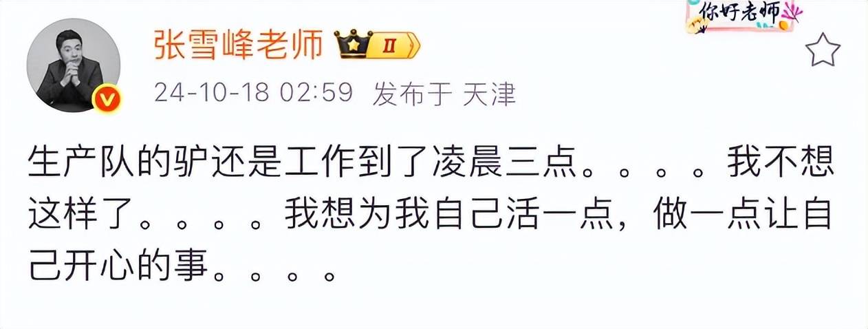 2024年和2025年,张雪峰更是忙得连轴转,尤其在2024年,张雪峰曾多次发布动态抒发心声,透露自己经常熬夜,十分疲惫,想要为自己活一点,做一点让自己开心的事。