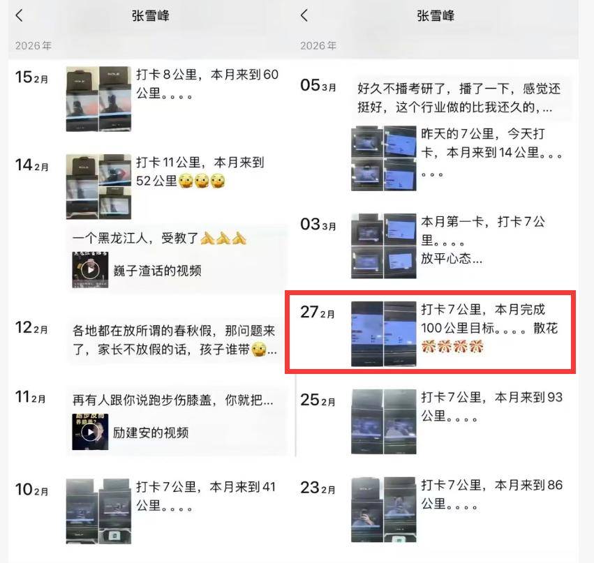 当下张雪峰的朋友圈动态已经遭到曝光,可以得知出事前两天,他还在坚持跑步锻炼,日里程数达到7公里,整个3月份已累计跑了72公里。