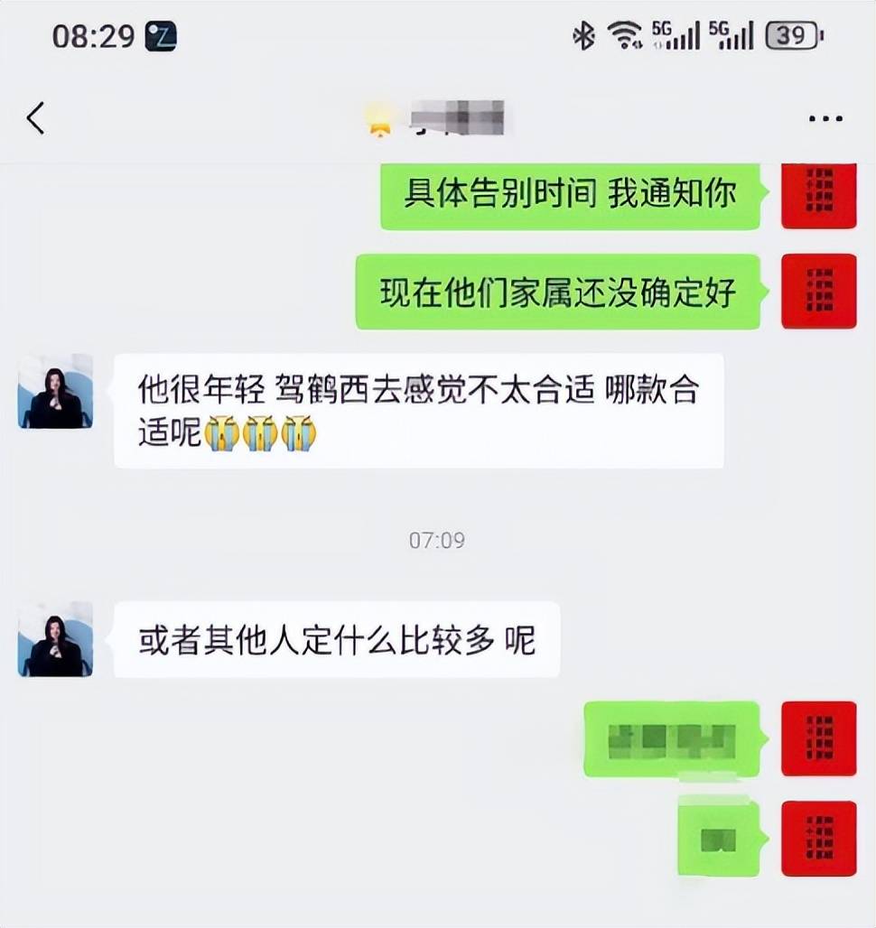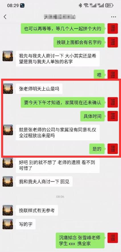他告知张雪峰的告别时间还没有确定,要到3月25日下午才知道,另外,还告知张雪峰家属低调办后事,葬礼的相关过程不会放出来。