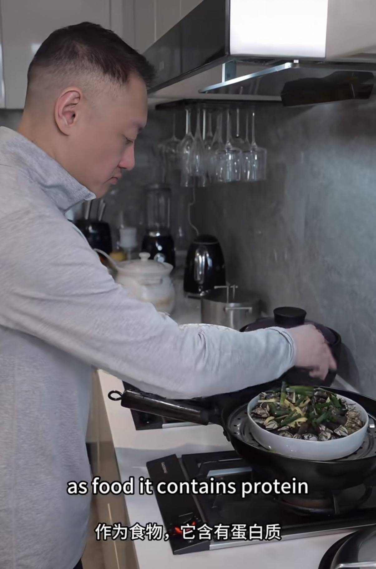 厨房里的汪雨,看着年轻帅气、很有魅力。他穿一件灰色高领上衣,认真做饭的模样太接地气了。