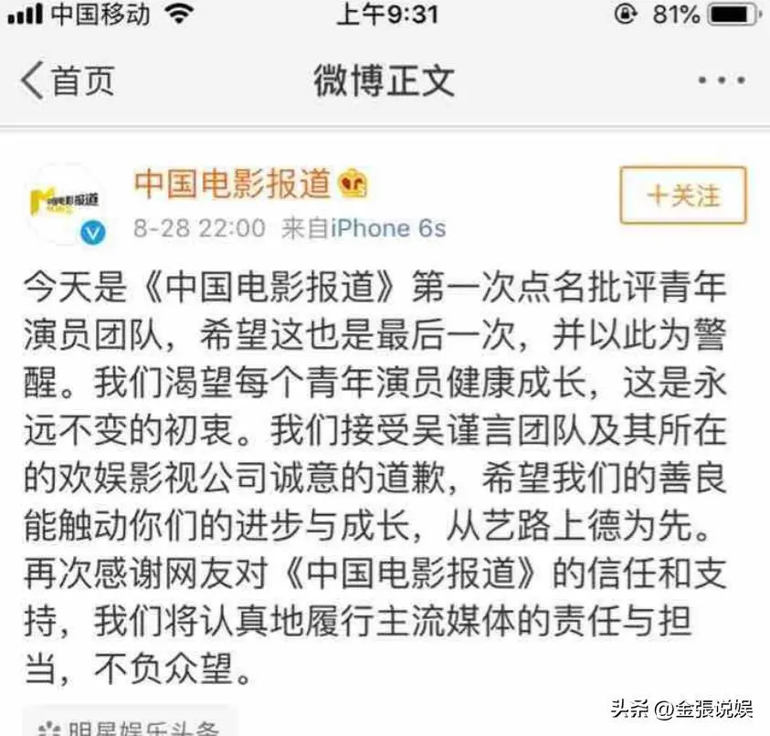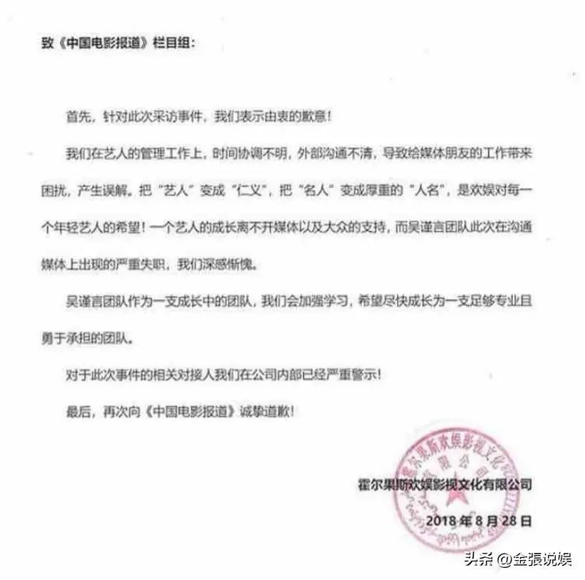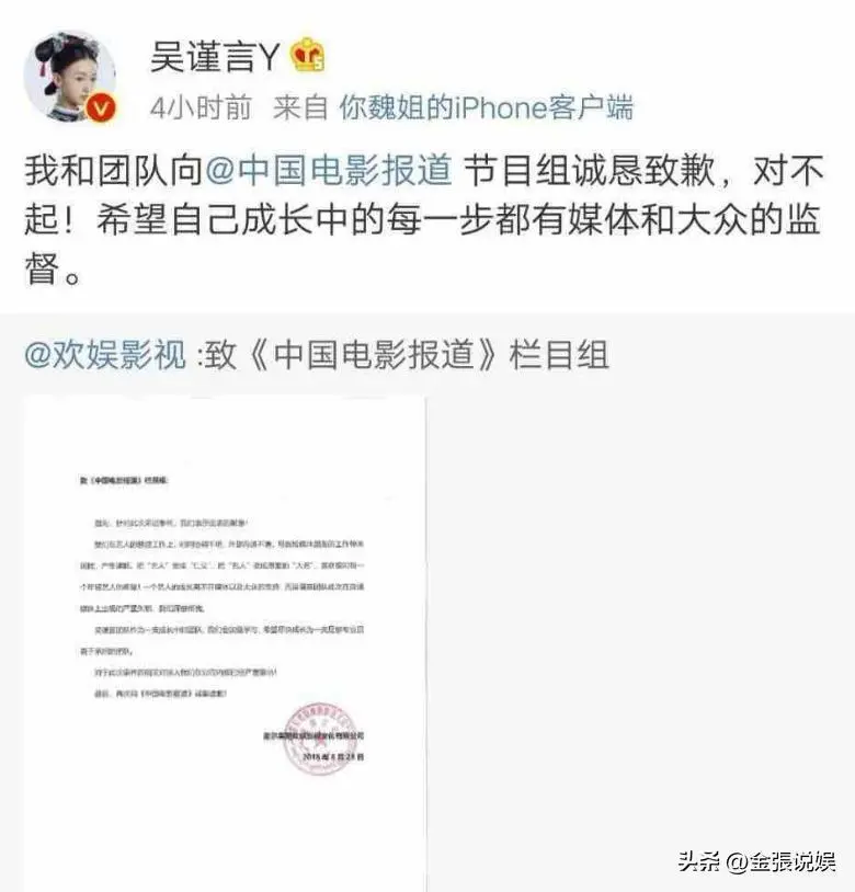 事后,吴谨言通过社交平台致歉,《中国电影报道》节目组表示接受。