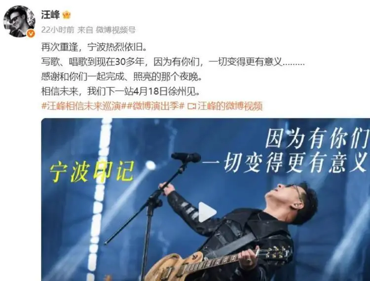 汪峰在3月24日中午,也就是张雪峰出事前,发布了一条时隔一个多月的动态,官宣自己下一场演唱会将落地徐州,满心期待与粉丝的双向奔赴。