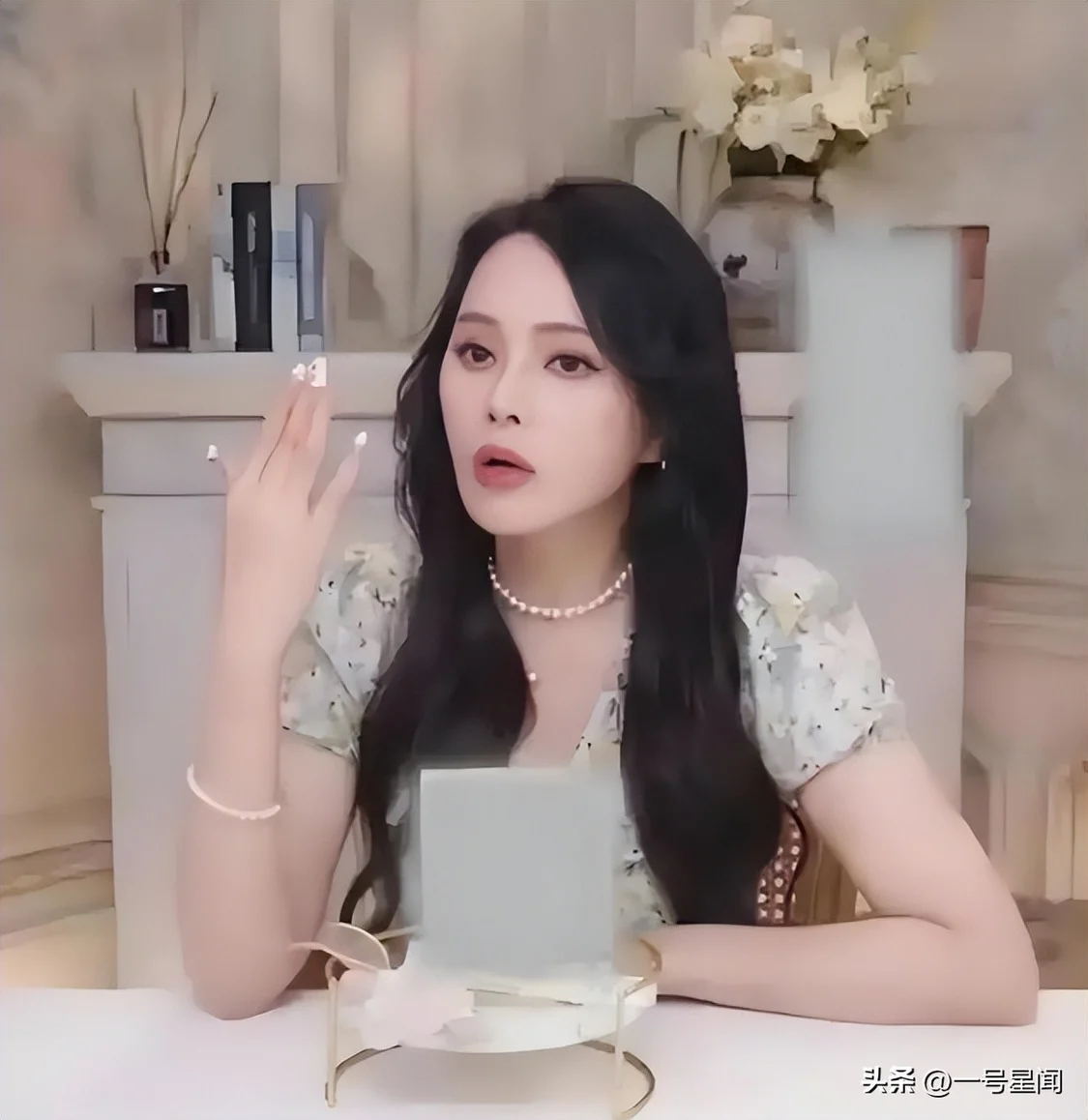 画面中,她依旧是长发披肩,微卷的发型搭配斜刘海,身后是直播间里搭建的场景,五彩斑斓的花,还有闪闪发光的亮片。
