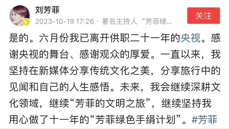 2023年6月,她从央视离职,离开了这个自己呆了21年的地方。