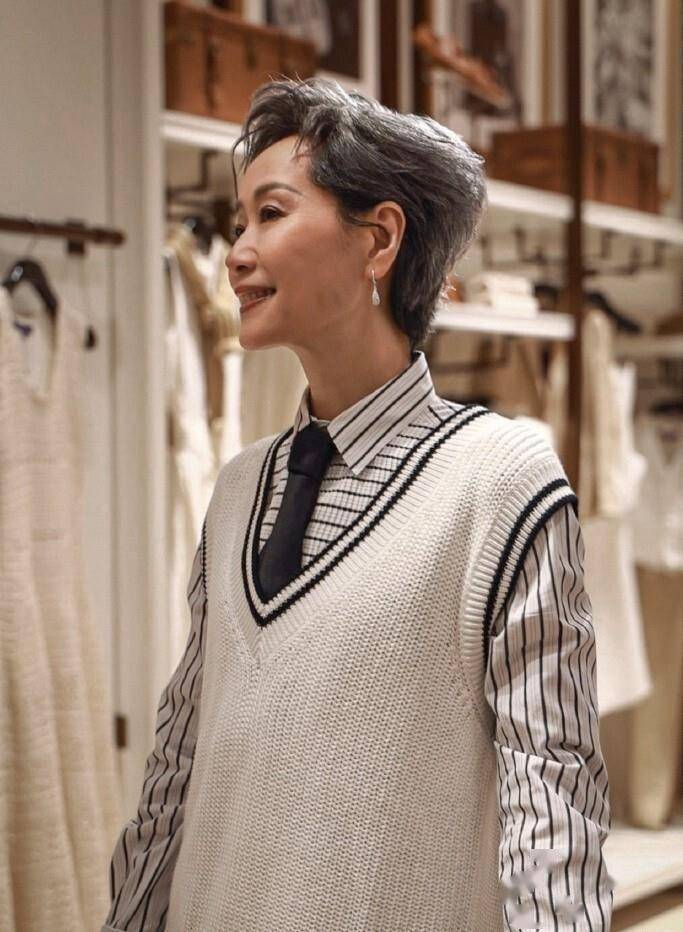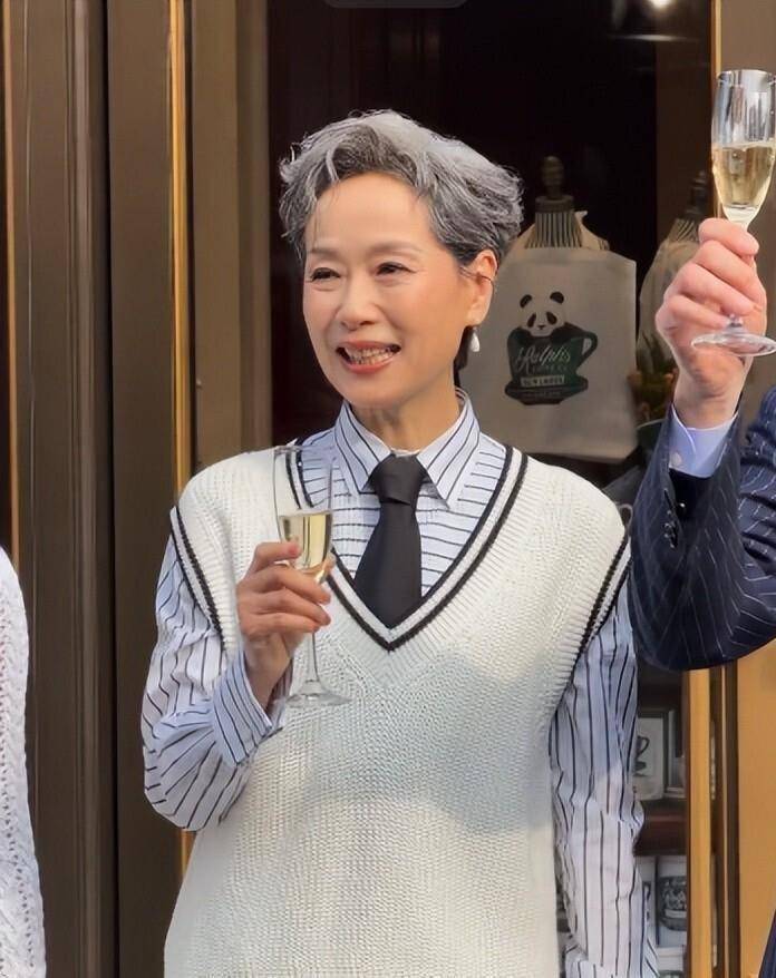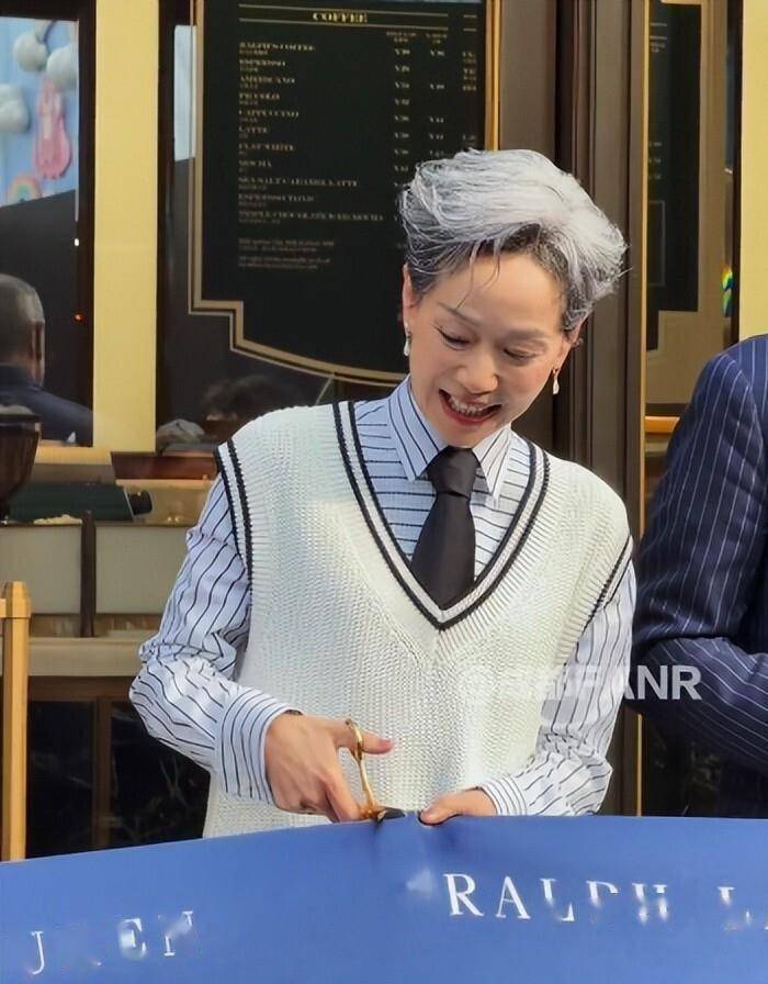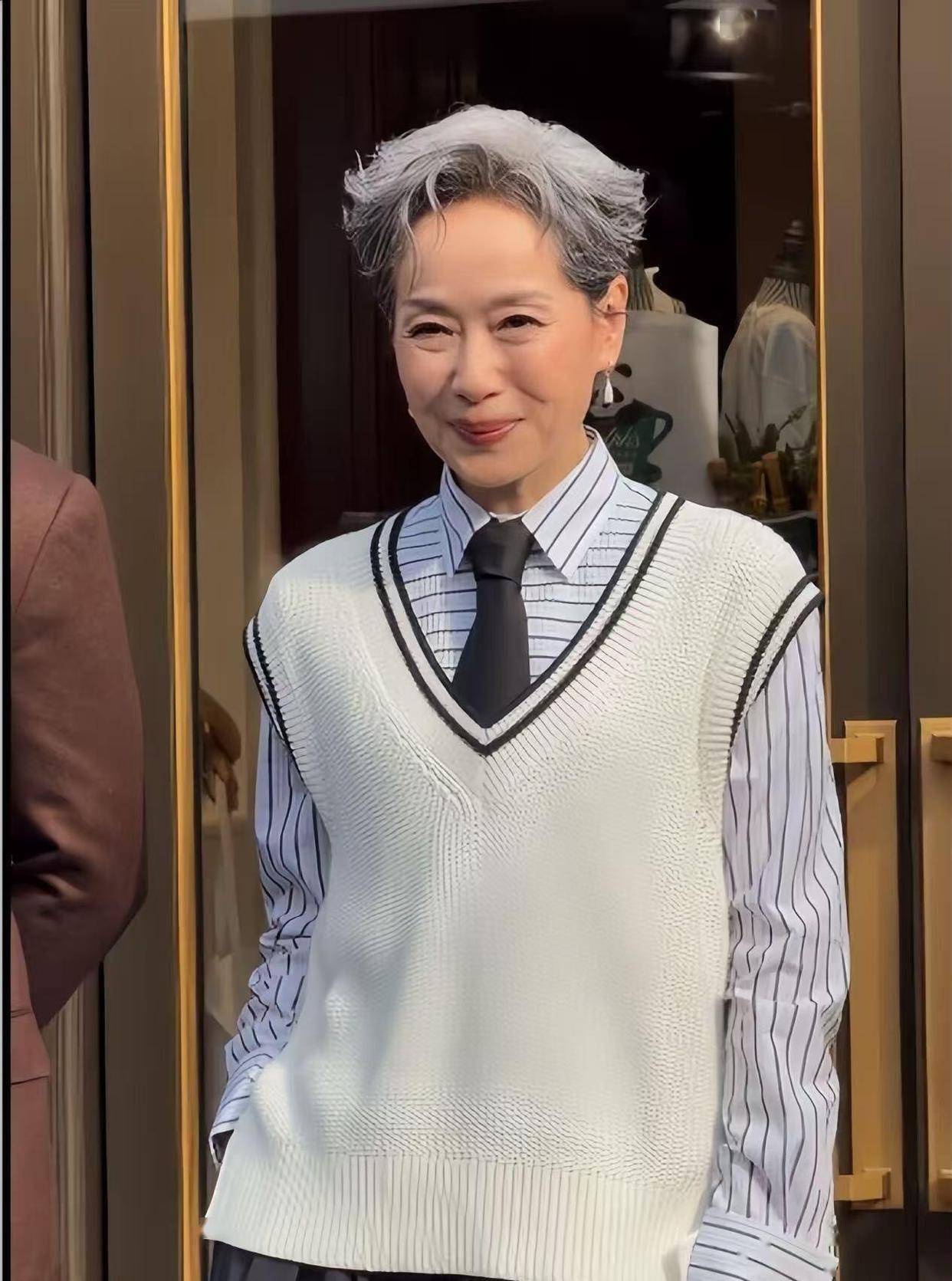 剪彩仪式上,63岁的叶童走出来时,现场安静了几秒。她穿了一身学院风,条纹衬衫外面套着镂空针织马甲,黑色阔腿裤,还系了条领带。最扎眼的是那头银发,在灯光下泛着灰白的光。